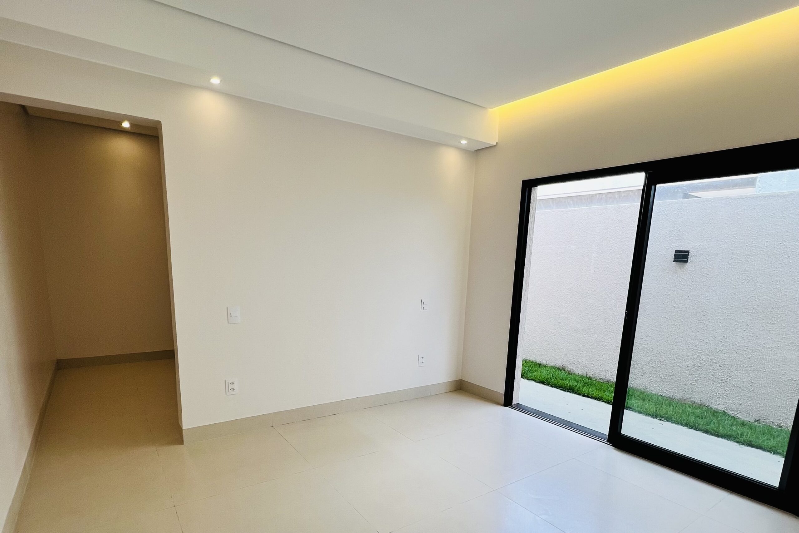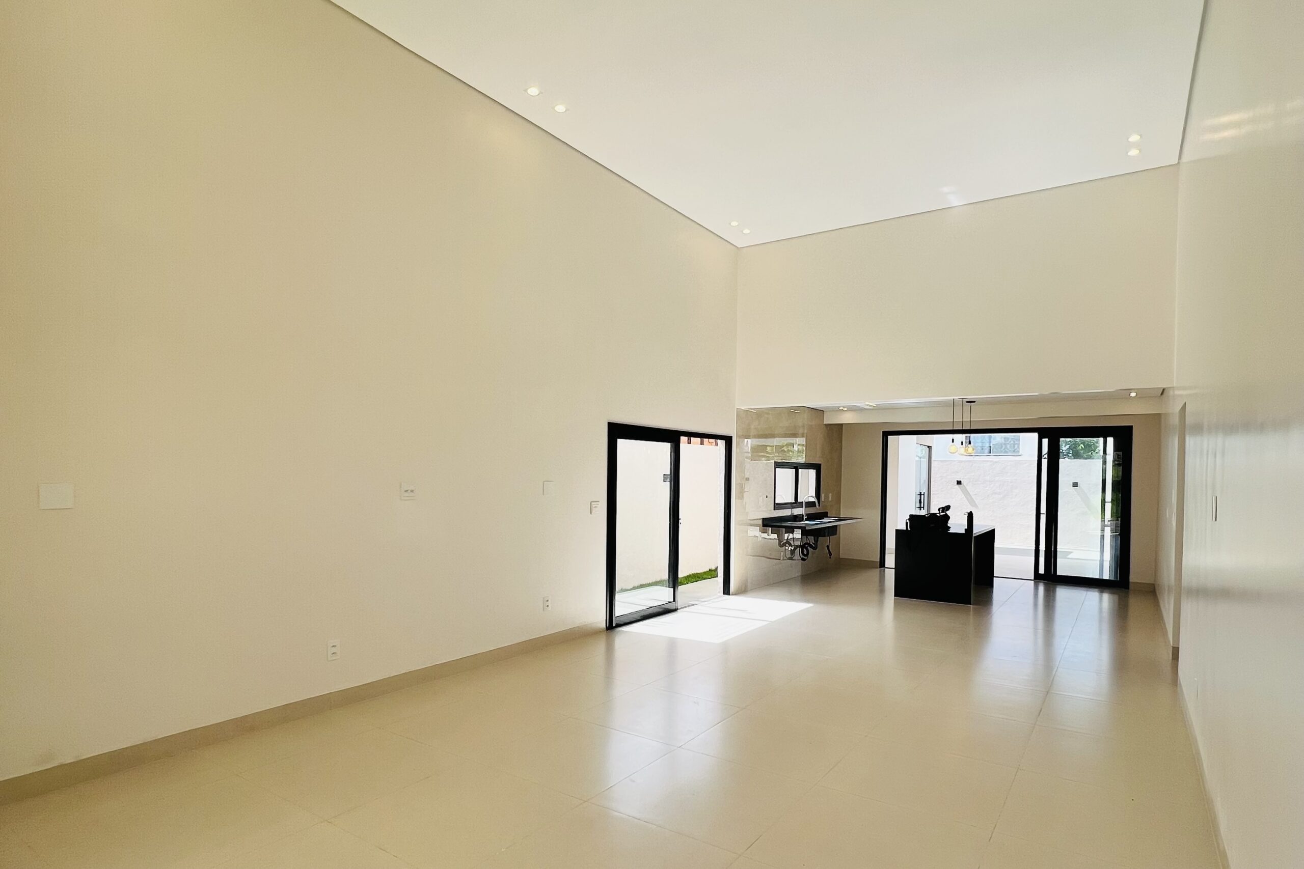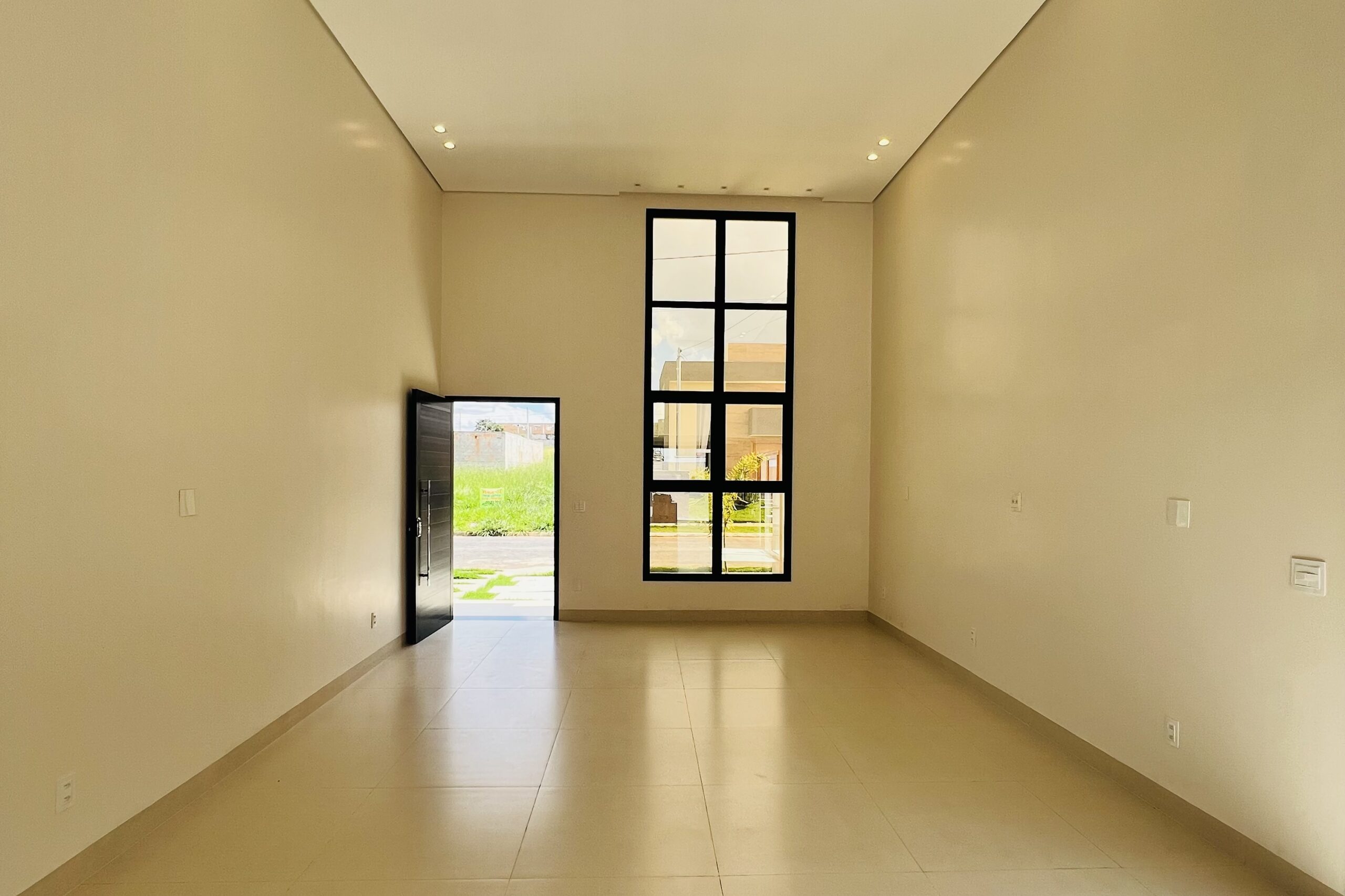 - Sala com pé-direito duplo e vidraça que valoriza a luz natural